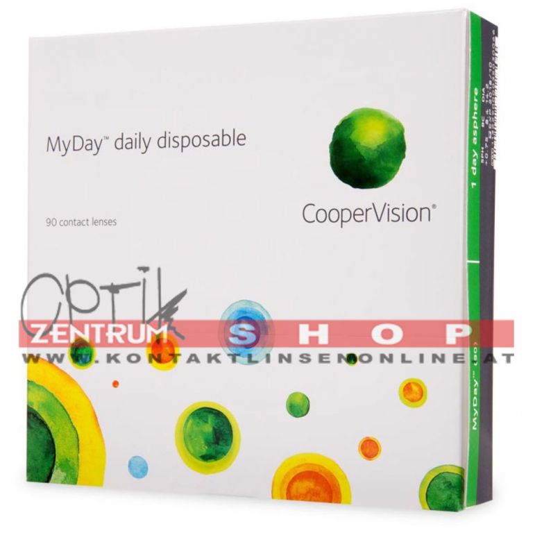 Box mit 90 MyDay Kontaktlinsen, MyDay Kontaktlinsen sind weiche Ein-Tages-Kontaktlinsen aus besonders weichem Silikonhydrogel-Material gefertigt. Durch ein neues, besonderes Verfahren, wird der Sauerstoff noch besser durch die Kontaktlinsen geleitet. So sorgen die MyDay daily disposable Kontaktinsen für eine hohe Atmungsaktivität und gleichzeitig für ein angenehm leichtes Tragegefühl.